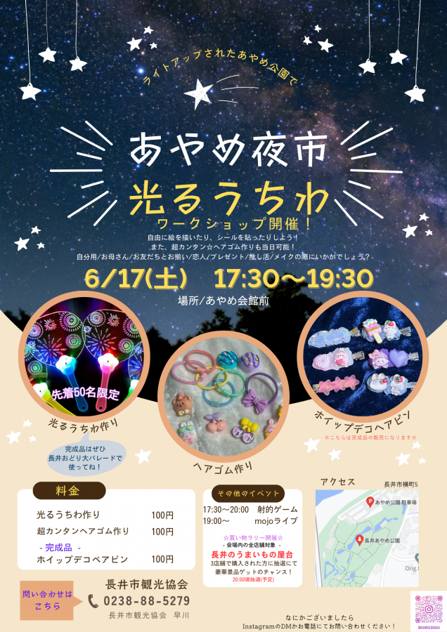 今週末の6/17(土)は、あやめ会館前にて【 あやめ夜市 】が開催されます!長井のうまいもの屋台も集まり、お買い物ラリーも開催!3店舗で買い物をし、シールを集めて抽選会に参加しよう!の企画もございます??そして今回のあやめまつりのテーマでもある「子ども向けイベント」として、毎年人気の射的ゲームもご準備しております!☆17:30〜20:00 射的ゲーム(1回(3発) 100円)☆17:30〜19:30 光るうちわワークショップ 先着50名限定 100円☆超かんたんヘアゴム作り 100円☆ホイップデコヘアピン(完成品) 100円光るうちわのワークショップに合わせて、急遽他にもご用意してみました(ノ^ω^)ノ”子どもはもちろんですが、小中高校生や老若男女問わず楽しんでいただけるワークショップになっているかと思います。年齢性別問わずどなたでもご参加可能♪こちらでもいくつかペンやシール等ご準備はしておりますが、もちろん材料(使いたい推しの写真や画像)の持ち込みも大歓迎!(ハサミやノリもご用意させていただきます)気軽に推し活もしていただけるかと思いますので、ぜひどなたでもご参加してみてください!また、ヘアゴム作りの材料はこちらでもご用意しております!ホイップデコヘアピンは既に完成品のみの販売となりますので、予め御了承ください。ワークショップでご質問等ある方は、事前に観光協会のInstagramの方にコメントかDMでお問い合わせいただけますと幸いです(*´?`*)※光るうちわの作成見本は当日飾っておきますぜひ皆様、夜のあやめ公園へお越しください!