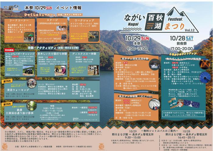 毎年、長井ダムの秋の紅葉盛りに開催している「ながい百秋湖まつり」。今年は10月28日(土曜日)に前夜祭、10月29日(日曜日)に本祭の開催が決定いたしました。前夜祭では、2年ぶりに長井ダム堤体のライトアップが実施されます。本祭では、長井ダム湖面巡視体験やガイド付き長井ダム探検隊を始めとした各種イベントをご用意しております。 本祭当日は、長井ダム管理支所にてワークショップ・ステージイベント・フードコーナーを含む「ひゃくしゅうこマルシェ」を開催いたします。ワークショップではスマホで撮影したダムや紅葉の写真を使ってオリジナルの缶バッチを作成することができます。ステージイベントでは居合道演武やけん玉パフォーマンス、ビックバンド「MOJO」のコンサートを予定しております。 また、野川まなび館では「いしぶちバギーチャレンジ」や「しいたけ菌打ち体験」などアクティブなイベントを実施いたします。イベント毎に会場や受付場所が異なりますので、詳細は下記「第12回ながい百秋湖まつりチラシ」データでご確認ください。皆様のご来場お待ちしております。第12回ながい百秋湖まつりチラシ(PDFファイル:2.7MB) 10月28日交通規制及び無料シャトルバスのご案内(野川まなび館〜長井ダム管理支所) 10月28日は下記の時間帯及び区間で、長井ダムライトアップに伴う交通規制を実施します。ご理解とご協力をお願いいたします。長井ダムライトアップへご参加や、長井ダム堤体上部周辺の自由散策のために長井ダム管理支所へ向かう方については、野川まなび館からの無料シャトルバスでのみ移動が可能となります。なお、竜神大橋より先に向かう方については、迂回路として市道ながい百秋湖線をご利用ください。