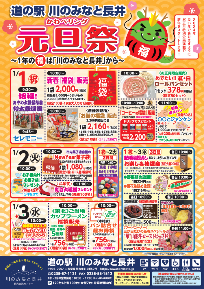 道の駅川のみなと長井 かわべリング『元旦祭』1/1(月) 1/2(火) 1/3(水) 〜1年の福は「川のみなと長井」から〜 2024年1/1(月) 9:30〜「和太鼓演舞」(あやめ太鼓保存会)でスタート!!〈9:45〜セレモニー〉※1/1〜1/3の営業時間は10:00〜17:00◆1/1恒例、超おトクな 新春「福袋」は限定100袋!(1家族大人の方1点限り)◆市内菓子店自慢のNewYear菓子袋や、プレゼント企画などお楽しみ企画が盛りだくさん!◆新春運試しお楽しみ抽選会(1月1日〜3日のお買物シート合算2000円ごとに1回!※福袋は対象外)また1日・2日は白山堂芳賀さん「お正月上生菓子対面販売」!1/1〜1/3は道の駅川のみなと長井【元旦祭】へGO!※企画内容、時間など詳細につきましてはチラシをご確認下さい道の駅 川のみなと長井 ≪年末年始の営業時間のお知らせ≫12月31日(日) 9:00〜17:001月1日(月) 10:00〜17:001月2日(火) 10:00〜17:001月3日(水) 10:00〜17:00※以降、1月・2月の冬季営業時間は 9:30〜17:00 となります