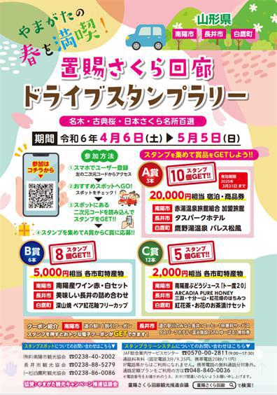 置賜さくら回廊ドライブスタンプラリー期間/令和6年4月6日(土) 〜 5月5日(日) ≪ 参加方法 ≫1.スマホでユーザー登録 (チラシのQRコードもしくはこちら)2.おすすめスポットへGO!3.スポットにある二次元コードを読み込んでスタンプをGET!4.スタンプを集めてA賞からC賞に応募 ≪ スタンプを集めて商品をGETしよう! ≫【 A賞 】スタンプ10個GET! 20,000円相当 宿泊・商品券南陽市…赤湯温泉旅館組合 加盟旅館長井市…タスパークホテル長井白鷹町…鷹野湯温泉 パレス松風※A賞の宿泊・商品券の有効期間は2025年3月31日までご使用いただけます※ 【 B賞 】スタンプ8個GET! 5,000円相当 各市町特産物南陽市…南陽産ワイン赤・白セット長井市…美味しい長井の詰め合わせ白鷹町…深山焼 ペア紅花釉フリーカップ 【 C賞 】5個スタンプGET!南陽市…南陽産ぶどうジュース「トー度20」長井市…ARCADIA PURE HONEY 三淵・十分一山・紅花畑のはちみつ白鷹町…紅花茶・お花のお茶漬けセット 各スポットの詳細・設置場所につきましては、チラシ(PDF)をご確認ください。 スタンプスポットについてのお問い合わせはこちら(特非)南陽市観光協会 0238-40-2002長井市観光協会 0238-88-5279(一社)白鷹町観光協会 0238-86-0086 置賜さくら回廊とは?置賜さくら回廊は、山形県南部に位置し四季折々の花に囲まれた、自然豊かで農産物も大変おいしい地域です。南陽市、長井市、白鷹町をつなぐ「置賜さくら回廊」は巨木・古木が多く点在する一番の見所となっております。
