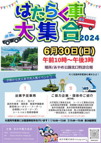 日時:6月30日(日) 10:00~15:00会場:北口特設会場/園内 毎年子どもたちを中心に人気を誇るはたらく車&キッチンカー大集合を開催いたします。警察車両をはじめ、消防車両、自衛隊などが北口特設会場に集まります。そして毎年大人気の高所作業車も登場!整理券は北口特設会場の本部で配布いたします。(各回限りがありますのでご了承ください。) 出展車両紹介パトカー、白バイ、消防車、軽装甲機動車、除雪車(ロータリー・ドーザー)、自衛隊(バイク・ジープ)、シートベルト効果体験車、高所作業車 また、キッチンカーがあやめ会館前に登場!クレープ、ハンバーガー、ジェラートなど美味しいものがたくさん♪キッチンカー紹介! アイデアのおもちゃ箱(馬肉ラーメン肉まん) 長井中央商店街振興会(うどん・そば) 楽街(あま恋ジェラート) SUKOFRUすこふる(フルーツサンド) cafeARB(ハンバーガー) tanatn'scafe (クレープ) どんどん焼きカフェカシワヤ(どんどん焼き) ☆.。.:*・°☆.。.:*・°☆.。.:*・°☆☆.。.:*・°☆.。.:*・°☆.。.:*・°☆見頃予想や最新状況などは、随時こちらの「長井市ポータルサイト」でお知らせします!是非チェックして下さいね!!長井あやめ公園のリーフレットや長井市の観光パンフレットの送付も行っております。ご希望の方はこちらからお気軽にお問い合わせください! 【長井市観光協会 公式アカウント】長井市観光協会ではFacebook・Instagramのアカウントを作成しております。桜、白つつじ、あやめの開花状況をお知らせする他、イベントの情報発信を行う予定です。是非お目通しくださいませ(*^ω^*)!!FacebookInstagram☆.。.:*・°☆.。.:*・°☆.。.:*・°☆☆.。.:*・°☆.。.:*・°☆.。.:*・°☆