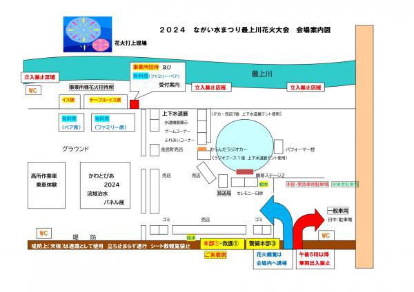 令和6年8月3日(土)開催の水まつり・最上川花火大会の会場案内図のお知らせ 当日の会場図となりますので、花火大会有料席ご購入のお客様は事前にご確認の上、「有料席受付テント」に午後6時以降にお越しください。 また当日有料席お支払いにつきましては「現金払い」のみとなっております。なるべく金額ピッタリでお越しいただけますと幸いです。花火大会当日はスタッフは全て現地の方におりますので、有料席のご予約・お問い合わせはお受けできませんのでご了承ください。 会場図につきましては7月12日に「花火大会プログラム」が市内配布されております。プログラムの裏面には受付テントの情報や、駐車場・シャトルバスの案内もございます。ご要望の方へはプログラムの送付も可能ですので、お気軽に下記のフォームよりお申し込みいただければと思います。 長井市観光関連 パンフレットご希望の方はこちらからお気軽にお問い合わせください! ☆.。.:*・°☆.。.:*・°☆.。.:*・°☆☆.。.:*・°☆.。.:*・°☆.。.:*・°☆ 席の空き状況に関しましては随時SNS(ストーリー)で更新いたしますので、お電話の際には是非ご確認ください。【長井市観光協会 公式アカウント】FacebookInstagram ☆.。.:*・°☆.。.:*・°☆.。.:*・°☆☆.。.:*・°☆.。.:*・°☆.。.:*・°☆