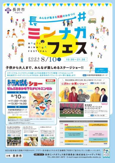 長井ミンナガフェス 開催!!開催日: 2024年8月10日 時間: 10:30~21:30 ☆イベント紹介☆長井市役所駐車場特設ステージ△▼△▼△▼△▼●ドラえもんショー 【時間 1回目/11:00~11:30 2回目/13:30~14:00】※整理券配布 (1回目 9:30、2回目 12:30 より長井市役所南側エントランス付近にて観覧整理券を配布します。)※各回先着200名とさせていただきます。(1組5名様まで) ●にぎわいお笑いショー 【時間 14:30~15:00】※出演者 ぱーてぃーちゃん / ラパルフェ ●東北楽天ゴールデンエンジェルスダンスパフォーマンス【時間 14:15~14:30】 ●けん玉ひろばSPIKeパフォーマンスショー 【時間 11:45~12:00】●ローラーアートライブペイントショー 【時間 10:35~10:50】●にぎわいステージ 【時間 12:00~12:45】●19:30~20:15 ナイトステージ 長井市役所前エリア▼△▼△▼△▼△▼△▼ 10:00~21:30 飲食エリア10:30~15:00 ミンナガみずまつり くるんとエリア▼△▼△▼△▼△▼△▼ ミンナガ道具パーク 【時間 10:30~15:00 /場所 くるんと周辺芝生エリア】くるんとマルシェ 【時間 10:30~ 終了時刻は店舗により異なります。 /場所 くるんと周辺芝生エリア】噴水ライトアップ 【時間19:30~21:00 / 場所:くるんと前噴水】 長井市制施行70周年記念事業●70周年記念市民パレード&長井おどり大パレード【時間 16:00スタート / 場所 桑島記念館前(スタート)〜中央十字路〜長井駅〜市役所駐車場特設ステージ(ゴール)】●70周年記念プロジェクションマッピング 【時間 20:15~20:30 / 場所 市役所前エリア(市庁舎に投影)】 ≪お問い合わせ≫ 長井ミンナガフェス実行委員会≪HP≫ 長井ミンナガフェス公式ホームページ 長井市ホームページ
