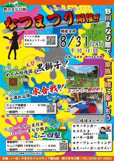 野川まなび館で、家族一緒に楽しもう!ながい百秋湖アクティビティの拠点野川まなび館でなつまつりを開催!午前中は 市内幼稚園の園児による黒獅子舞と大人も子どももずぶ濡れ必須の水合戦を開催!午後からはミニ四駆レース!第1回野川まなび館カップを開催します!縁日コーナーではスーパーボールすくいやナーフシューティング! 4輪バギーの試乗体験も!キッチンカーやコストコ商品の特別販売ブースもあるよ!大人も子どもも1日思いっきり遊びましょう!●開催日:2024年8月31日(土)9:30〜16:00●会場:長井市野川まなび館(長井市平山2743-4)●ウェブサイト:https://tour.arcadia-kanko.jp/products/detail/377●問い合わせ:(一社)やまがたアルカディア観光局 野川まなび館 TEL:0238-87-0605