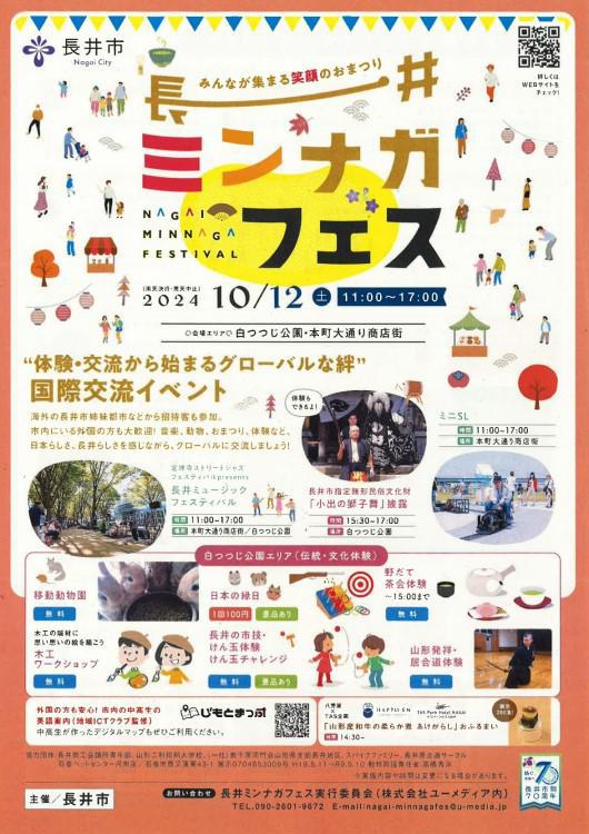 長井ミンナガフェス 開催!!開催日: 2024年10月12日(土) 定禅寺ストリートジャズフェスティバルpresents 長井ミュージックフェスティバル 時間 11:00~17:00 /場所 本町大通り商店街・白つつじ公園 本町わくわくカーニバルトレイン ミニSL時間 11:00~17:00 /場所 本町大通り商店街 長井市指定無形民俗文化財 「小出の獅子舞」披露 時間 15:30~17:00 /場所 白つつじ公園 白つつじ公園エリア+++——————————+++・移動動物園 ・山形工科短期大学校連携施策木工ワークショップ ・長井の市技・けん玉体験 けん玉チャレンジ・野だて茶会体験 〜15:00まで・山形発祥・居合道体験・日本の縁日 《1回100円・景品あり》 八芳園×TAS企画 限定200食! 「山形産和牛の柔らか煮 あけがらし」のおふるまい △▼△▼△▼△もとまち青空フェスティバル2024▼△▼△▼△▼△▼時間 11:00~17:00 場所 本町大通り商店街・らくがき広場・カップラーメン&お菓子積み大会 先着順→13:00から受付開始 《参加料:こども300円・中学生以上500円》・もとまち大ビンゴ大会 《参加無料》・フリーマーケット・もとまちテント市、オープンカフェ・スタンプラリー [10月20日まで開催中] 詳しくは下記のお問い合わせ先をご覧ください≪お問い合わせ≫ 長井ミンナガフェス実行委員会≪HP≫ 長井ミンナガフェス公式ホームページ 長井市ホームページ