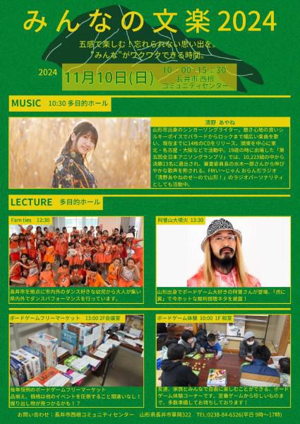 今年も「みんなの文楽」が開催されます。場所は長井市西根地区コミュニティセンターで、日時は11月10日 10:00~15:30です。入場無料となります。 ミュージック、お笑い、ダンス、ボードゲーム、ワークショップ、マルシェなど盛りだくさん!詳しくはチラシをご覧ください。 イベント紹介△▼△▼△▼MUSIC 10:30~ (多目的ホール) 清野あやねLECTURE (多目的ホール)12:30 Fam ties 13:30 阿曽山大噴火 13:00 ボードゲームフリーマーケット 10:00 ボードゲーム体験(1F和室)SHOP 10:00 (体育館)