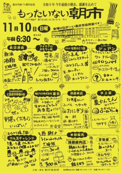 11月10日(日曜日)に、令和6年最後の朝市が開催されます。会場は長井市役所前で、時間は午前6:30~です。ワケあり商品や、捨てるにはもったいないものまでずらり…!詳しくはチラシをご覧ください。 店舗紹介△▼△▼△▼△▼長沼酒造・アイデアのおもちゃ箱・伊佐沢安部ぶどう園・レストランジュアン産地野菜直売所 ド田舎停車場の会・俺たちの株式会社 楽街・須藤米店・水上屋《本部販売》後藤屋肉店・菅麩屋・キムラヤ