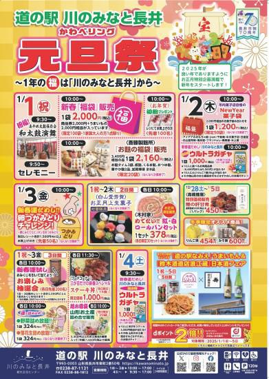 1月1日から道の駅川のみなと長井元旦祭が開催されます!! 2025年1/1(月) 9:30〜「和太鼓演舞」(あやめ太鼓保存会)でスタート!! 〈9:45〜セレモニー〉※1/1〜1/3の営業時間は10:00〜17:00◆1/1恒例、超おトクな 新春「福袋」は限定100袋! (1家族大人の方1点限り)◆市内菓子店自慢のNewYear菓子袋やウルトラガチャ(1回1000円(1/2は100名様・1/4は50名様))、卵つかみどりチャレンジ(1/3のレシート合計1500円以上の方、50名様限定)などお楽しみ企画が盛りだくさん!◆新春運試しお楽しみ抽選会(1月1日〜3日のお買物シート合算2000円ごとに1回! ※福袋は対象外)♦1月1日〜3日までの3日間、フードコーナーにて「三が日だけの新春スペシャルステーキ丼」を限定価格1000円で販売![各日限定15名]♦1日~5日の5日間、福島県浪江町の復興のシンボル『道の駅なみえ』うまいもん&『鈴木酒造店浪江蔵』日本酒フェア開催! また1日・2日は白山堂芳賀さん「お正月上生菓子対面販売」と木村屋本店の「めでたい!!紅・白ロールパンセット」販売!!※企画内容、時間など詳細につきましてはPDFをご確認下さい道の駅 川のみなと長井 ≪年末年始の営業時間のお知らせ≫12月31日(日) 9:00〜17:001月1日(月) 10:00〜17:001月2日(火) 10:00〜17:001月3日(水) 10:00〜17:00※以降、1月・2月の冬季営業時間は 9:30〜17:00 となります