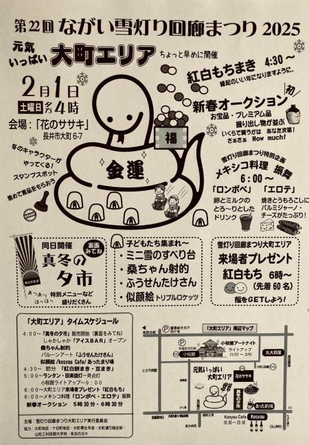 ながい雪灯り回廊まつりの5商店街のひとつ「大町エリア」を紹介!詳しくはPDFをご覧ください。 開催日時:2月1日(土) 午後4時〜会場:花のササキ (住所:長井市大町6-7) ◆━━━━━タイムスケジュール━━━━━━◆午後4時〜「真冬の夕市」販売開始『長沼酒造・アイデアのおもちゃ箱・ブランドォレ・菅麩屋・たかしの焼いもじんぐう寺農園・水上屋・とらや旅館・アメフラシ×長井ブルワリークラフトマンなど』アイスBAR/桑ちゃん射的/ふうせんたけさん/似顔絵/kosyau Cafe/あったまり場午後4時30分〜節分「紅白もちまき・豆まき」午後5時〜ランタン・田楽提灯一斉点灯/小桜館ライトアップ(午後9時まで)午後6時〜大町エリア来場者プレゼント「紅白もち」メキシコ料理「ロンポぺ・エロテ」振舞午後5時30分・午後6時30分新春オークション ・ミニ雪のすべり台 主催:雪灯り回廊まつり大町エリア実行委員会