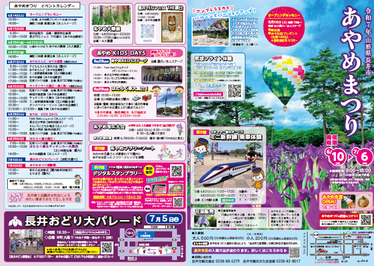 令和7年山形県長井市あやめまつり 開催期間 6/10(火)~7/6(日)営業時間 9:00〜18:00(6/21(土)は20:30まで営業)■入園料 大人 500円(20名様以上団体400円) 小人 200円(20名様以上団体100円) ※小人(小・中学生) 開花の状況等により、開催内容・開園時間が変更となる場合あり あやめ食堂OPEN! 11:00~15:00 花苗販売 花菖蒲苗販売 13種以外の長井古種 長井系:700円 上記以外(改良種他):500円 花菖蒲切り花販売 6/20頃〜:500円/5本セットあやめまつりの終盤に、公園内に咲いている花菖蒲切り花を販売します。貴重な長井古種の切り花をお楽しみください。 ※販売期間は花の咲き具合により前後する場合がございます。 ◆━━━━━━━━━━━━━━━━━━━━◆ ★新企画 ★デジタルスタンプラリースマホで簡単♪あやめ公園のほか、各スポットを巡ってスタンプを集めると「米沢牛」や「お米」など商品が当たるチャンス!詳しくはこちら開催期間:6月7日(土)〜7月6日(日) ★ミニ新幹線乗車体験今までで一番ながーい?ミニ新幹線がやってくる!日程:6月21日(土)11:00~17:00 6月22日(日)10:00~16:00会場 北口特設会場 雨天中止体験料 子ども:100円 大人:200円 ★タビイコフォトコンテストInstagramでの投稿で、条件を満たした方の中から選定、受賞した方には豪華景品をプレゼント!詳しくはこちら開催期間:6月10日(火)〜8月31日(日) ◆━━━━━━━━━━━━━━━━━━━━◆ あやめまつりイベントカレンダー 6月14日(土) オープニングセレモニー10:00~ ご祈祷、あやめ苗プレゼント(先着100名様)14:00 ~ 津軽三味線 高橋兄弟【水上ステージ】 6月15日(日) 6:30~ 御利益朝市 会場:總宮神社参道11:00~15:00 長井YEGフェス THE縁日【あやめ会館前】 6月20日(金)〜6月22日(日)10:00~17:00(入館は16:30まで) あやめ大華展【丸大扇屋】 6月20日(金) 14:00~ 津軽三味線 高橋兄弟【水上ステージ】 6月21日(土) あやめらんど/あやめ酒場 8:30~11:00 子どもも大人も写生大会【園内】11:00~15:00 あやめらんど【あやめ会館前】11:00~17:00 ミニ新幹線乗車体験【北口特設会場】 17:00~20:30 あやめ酒場【あやめ会館前】17:00~19:00 気球フライト体験 会場:長井TBC球場(予約優先) 6月22日(日) キッチンカー大集合〜食と舞〜 7:00~9:00 気球フライト体験 会場:長井TBC球場(予約優先)10:00~ 結城市物産展【あやめ会館前】10:00~15:00 キッチンカー大集合【あやめ会館前】10:00~16:00 ミニ新幹線乗車体験【北口特設会場】10:30~ ダンスパフォーマンス【あやめ会館前】◇10:00~ ◇13:00~ 黒獅子舞【あやめ会館前】 6月28日(土) あやめ KIDS DAYS11:00~ Fam ties(ファムタイズ)【水上ステージ】13:00~ 長井市北中学校【無料休憩所】14:00~ そらいろこども合唱団【水上ステージ】15:00~ 長井市小学校【無料休憩所】17:00~19:00 気球フライト体験 会場:長井TBC球場(予約優先) 6月29日(日) はたらく車大集合! 7:00~9:00 気球フライト体験 会場:長井TBC球場(予約優先) 10:00~15:00 はたらく車&キッチンカー大集合【北口特設会場・園内】14:00~ あやめ歌謡祭【水上ステージ】 7月5日(土) 長井おどり大パレード【本町大通り】 7月6日(日) あやめまつり感謝祭13:30~ 写生大会表彰式【園内無料休憩所】14:00~ もちまき【園内】 ◆━━━━━━━━━━━━━━━━━━━━◆ ●野だて茶会 6月14日(土)、15日(日) 21日(土)、22日(日) 28日(土)、29日(日) 10:00~15:00 長井商工会議所女性会 場所 あやめ公園東屋 □あやめ写生大会 ★今年は大人も参加できます!(当日受付) 日時:6月21日(土)8:30~11:00 8:30~北入園口で受付 □あやめ写生展(あやめ写生大会の出展作品を展示します) 期間:6月30日(月)〜7月6日(日) 場所:道の駅「川のみなと長井」 関連イベント ●《ながいピオニーの森》(しゃくやく公園) 入場無料 しゃくやくまつり 5/24(土)〜6/9(木) 10:00〜17:00 所在地:長井市寺泉4246-2 TEL:050-3490-0222 無料Wi-Fi完備 『140種類8,000株』の芍薬をご覧いただけます。キャンプ場・トレーラーハウス・温泉・さくら食堂が敷地内にございます。 ●あやめ祭り囲碁大会 日時:6月22日(日) 〈受付〉9:30〈開始〉10:00場所:長井市民文化会館 参加料:2,200円(昼食付き) 対局:四段以下・五段以上(各五局対局)各クラス5位まで賞品 お問合せ先:090-4557-8559(梅津)