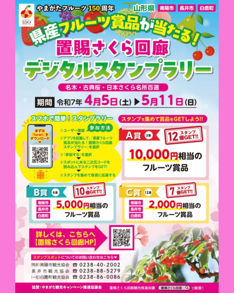 県産フルーツ賞品が当たる!置賜さくら回廊 デジタルスタンプラリー《実施期間》2025年4月5日(土)〜5月11日(日) 置賜さくら回廊(南陽市、長井市、白鷹町)のさくらを巡り、山形県産フルーツ賞品をゲットしよう!置賜さくら回廊では、南陽市・長井市・白鷹町のさくらと各エリアの観光施設を巡るスタンプラリーを実施します!抽選で素敵な『フルーツ賞品』をプレゼント!賞品は『やまがたフルーツ150周年』を記念し、フルーツ関連賞品が当たります!A賞は、豪華10,000円相当!※スタンプの数によってA賞・B賞・C賞に応募できます置賜さくら回廊の桜スポットをはじめ、お買物スポットや施設を『デジタルスタンプラリー』で楽しみながら皆さんで巡ってみてはいかがでしょうか!スマホで簡単!スタンプラリーはもちろん参加無料!アプリ【furari】(ふらり)をダウンロードし、各スポットに設置された『QRコード』を読み込むとスタンプをゲットできます実施期間は【2025年4月5日(土)〜5月11日(日)】GW過ぎまで設定していますので、もし桜の花が見頃を過ぎた後でも継続してチャレンジ、多くのスポットでスタンプをGETできるチャンスです♪ぜひお気軽に、多くの皆様のご参加をお待ちしております♪ ▼まずはアプリをダウンロード▼(無料) iPhoneの方はコチラ → App Store androidの方はコチラ → Google Play(実施期間4/5(土)〜5/11(日)※ご参加の方はデジタルスタンプラリーアプリ 『furari』(ふらり)をダウンロードお願いします。※この投稿のマークのアプリです※無料/カンタン♪『ふらりアプリ』で検索/ダウンロード(無料)↓ 『置賜さくら回廊デジタルスタンプラリー』選択して参加しよう!〈協賛/やまがた観光キャンペーン推進協議会〉