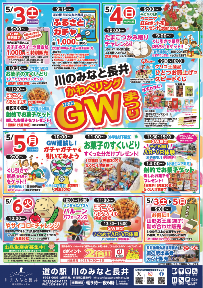 5月3日(土)〜6日(火) の4日間、「川のみなと長井GWまつり」開催!市内お菓子屋さんの「おすすめスイーツ詰合せ」特別販売や、1回1000円でお得な景品をご用意した「ふるさとガチャ」、こどもの日のお子様向け無料イベントなどなど、 日替わりで楽しいイベント盛りだくさん! GWの思い出作りにぜひ、ご来店お待ちしております♪