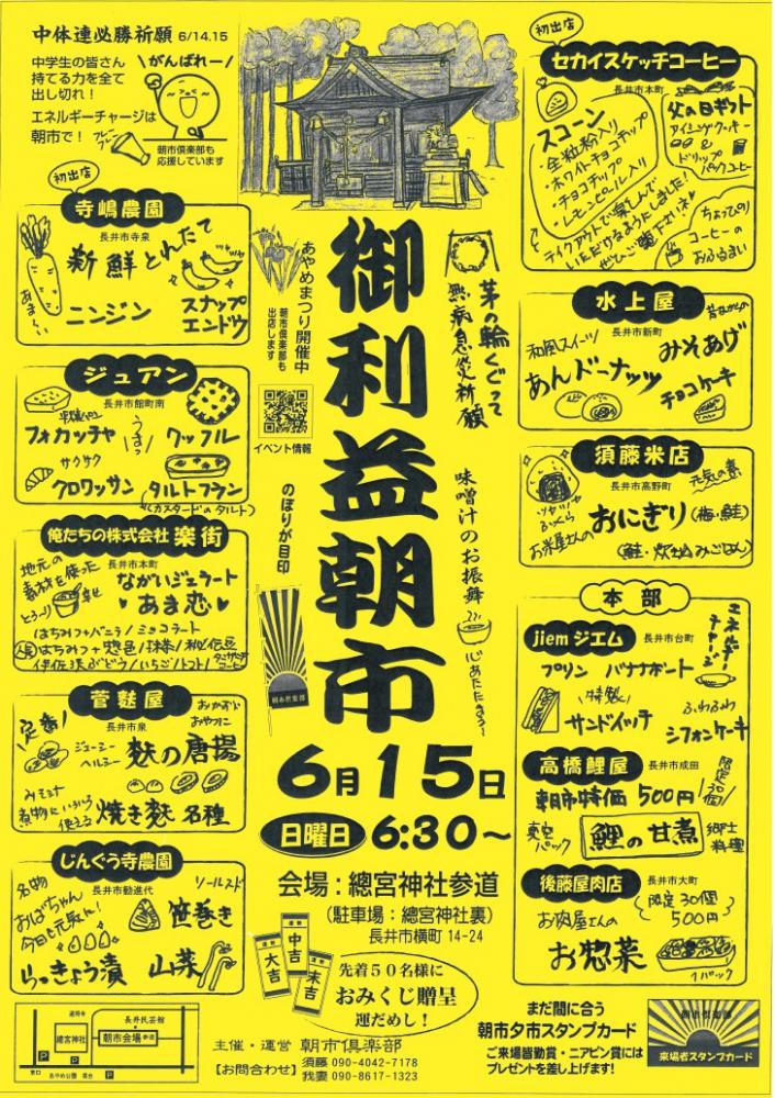 〜あやめまつり 御利益朝市〜日時:6月15日(日) AM 6:30〜会場:山形県長井市横町、總宮神社・参道にて朝市倶楽部主催の「御利益朝市」を開催いたします!今回のテーマは何と「中体連必勝祈願!」14日・15日開催される中体連の大会を朝市倶楽部さんが全力で応援! *・゜゚・*:.。..。.:*・*:゚・*:.。. .。.:*・゜゚・**・゜゚・*:.。..。.:*・*:゚・*:.。. .。.:*:.。. .。.:* 当日は… ・心温まるお味噌汁のお振舞・茅の輪くぐっての無病息災祈願・地元の美味しい食材が味わえるたくさんのお店も勢ぞろい(^^♪先着50名様に おみくじ贈呈 運だめし☆☆ など、お楽しみが盛りだくさん(^^)少し早く起きて、神社で必勝祈願?!そして朝市でエネルギーをチャージ! ・・もう100%勝ちパターンですね!皆さまのお越しをお待ちしております! 問い合わせ090-4042-7178(須藤)090-8617-1323(吾妻)