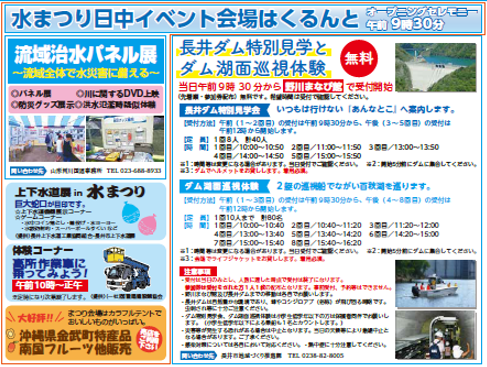 開催日 令和7年8月2日(土)■□ ダム特別見学会 □■ いつもは行けない『あんなところ』へ案内します!【受付方法】午前(1〜2回目)の受付は午前9時30分から、午後(3〜5回目)の受付は午前12時から『野川まなび館』にて受付開始します。 【定員】1回8人 計40名【時間】1回目/10:00〜10:50 2回目/11:00〜11:50 3回目13:00/13:50 4回目/14:00〜14:50 5回目/15:00〜15:50 ※受付後 各々ダムまで移動をお願いします。 開始5分前にダムに集合してください。 ※ダムでヘルメットお貸しします。着用必須。 ◆(先着順・参加券配布) 無料です ◆希望時間は受付でご確認ください ■□ ダム湖面巡視体験 □■ ←※中止※「ダム湖面巡視体験」は水位低下の影響により残念ながら中止となりました(2025.7.29) 2艇の巡視船でながい百秋湖を巡ります!【受付方法】午前(1〜3回目)の受付は午前9時30分から午後(4〜8回目)の受付は午前12時から『野川まなび館』にて受付開始します。【定員】1回10人 まで 計80名【時間】 1回目/10:00〜10:40 2回目/10:40〜11:20 3回目/11:20〜12:00 4回目/13:00〜13:40 5回目/13:40 〜14:20 6回目/14:20〜15:00 7回目/15:00〜15:40 8回目/15:40 〜16:20 ※受付後 各々ダムまで移動をお願いします。 開始5分前にダムに集合してください。 ※会場でライフジャケットをお貸しします。着用必須。 《 注意事項 》・長井ダムは自然豊かな環境であり、蜂やホシジロ・アブ(俗称)が飛び回る時期です。虫刺され等には十分ご注意ください。・ダム特別見学会、湖面巡視体験は小学生低学年以下の方は保護者の同伴でお願いします。・当日の天候等により急遽中止になる場合がございます。ご了承ください。・感染対策については各自において対応ください。・熱中症に十分注意してください。 ※最も重要な注意事項は下記になります ※受付は当日のみとし、人数に達した時点で受付は終了する予定です。 事前受付・予約等はできません。 参加券は、1人1枚の配布になります。(代理受取は禁止) 問い合わせ先長井市地域づくり推進課 TEL0238-82-8005