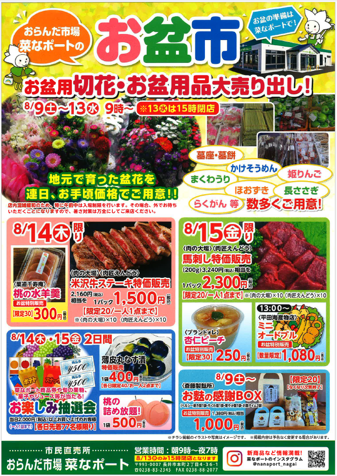 菜なポートのお盆市 開催!開催日:8月9日〜8月15日 9:00〜19:00 (13日は15:00まで)8月9日〜8月13日はお盆用切花・お盆用品大売り出し!!地元で育った盆花を連日、お手頃価格でご用意しております。他にも墓座・墓餅・かけそうめん・姫りんごなど数多くございます。9日〈斎藤製麩所〉お麩の感謝BOX【限定20個】14日〈肉の大場〉〈肉匠えんどう〉米沢牛ステーキ特別販売! 【限定各20セット/1人1点まで】(肉の大場×10 肉匠えんどう×10)〈菓道千寿庵〉桃の水羊羹【限定30個】 15日〈肉の大場〉〈肉匠えんどう〉馬刺し特価販売! 【限定各20セット/1人1点まで】(肉の大場×10 肉匠えんどう×10)〈ブランドォレ〉杏仁ピーチ【限定30個】13:00~ 〈平田海産物店〉ミニオードブルお盆特別販売【数量限定】 14日・15日 2日間お楽しみ抽選会 【先着77名限り】※当日2,000円(税込)以上お買い上げのお客様対象(1人1回まで)薄皮丸なすつけ 特価販売【限定40袋1人2点まで】桃の詰め放題! 詳しくはチラシをご覧ください。