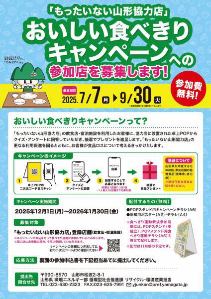 〜めざせ!食品ロスゼロ!おいしく楽しく食べきろう!〜「もったいない山形協力店」食べきり運動 実施中! 山形県では現在、食品ロス削減のため12月からスタートする「もったいない山形協力店」おいしい食べきりキャンペーンへの参加店を募集しています!お客様と一緒に食品ロス削減に取り組んでみませんか?協力店の参加と新規登録をお待ちしています! 〇問い合わせ山形県環境エネルギー部 循環型社会推進課 リサイクル・環境産業担当TEL:TEL:023-630-2323FAX:023-625-7991メール:yjunkan@pref.yamagata.jp 〇応募方法 参加申込書をFAXまたはメール、電子申請よりご提出ください 電子申請:https://apply.e-tumo.jp/pref-yamagata-u/offer/offerList_detail?tempString=R7tabekiri 詳しくは以下の県HPから↓https://www.pref.yamagata.jp/050010/kurashi/kankyo/recycle/kyouryokuten/tabekiricampaignr6.html 〒990-8570 山形市松波2−8−1 山形県 環境エネルギー部 循環型社会推進課 リサイクル・環境産業担当TEL:023-630-2323 FAX:023-625-7991