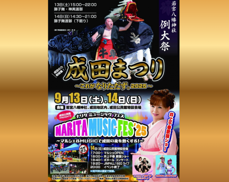 若宮八幡神社 例大祭【成田の力総結集!成田まつり〜これがなりただず。2025〜】開催日/9月13日(土)・14日(日)会場/若宮八幡神社、成田地区内、成田公民館特設会場 13日(土) 前夜祭◆黒獅子 15:00〜 獅子舞・神輿渡御、22:00 終了予定14:00〜 子ども達あつまれ!(神社境内出店) 射的、かた抜き、くじ引き&駄菓子14:00〜17:00 八幡茶屋 北東店 (神社境内出店) 焼き鳥、生ビール他 14日(日) 例大祭◆黒獅子 14:30〜 獅子舞渡御(下廻り)、21:00 終了予定17:00〜マルシェOPEN☆マルシェ店舗☆・高橋鯉屋・齋藤麩屋・黒獅子ブランド・長井観光 はぎ苑地元の美味しいものたくさん(*'ω'*)□おもちゃ屋(金魚すくい、くじ引きなど)□成田グッズ(Tシャツ、タオル)の販売もあります! 成田公民館PRESENTS ナリタ ミュージックフェス'2518:00〜井上千春 歌謡ショー18:40〜ボヌール コンサート19:20〜JINPALL 1920 ライブ20:00 イベント終了※雨天時は講堂で開催 《獅子舞・御神輿 渡御絵図》※花場を開設致します(本部テント)個人協賛、企業協賛を承ります。ご支援の程宜しくお願い致します! 〜マルシェ&ミュージックで成田の夜を熱くする!〜成田まつりに是非お越しください。