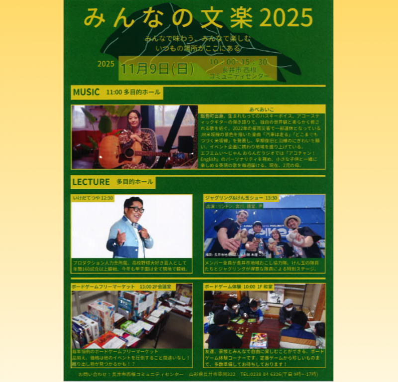 今年も「みんなの文楽」が開催されます。場所は長井市西根地区コミュニティセンターで、日時は11月9日(日) 10:00~15:30です。入場無料となります。 イベント紹介△▼△▼△▼MUSIC 11:00~ (多目的ホール) あべあいこLECTURE (多目的ホール)12:30 いけだてつや 13:30 ジャグリング&けん玉ショー 13:00 ボードゲームフリーマーケット(2F会議室) 10:00 ボードゲーム体験(1F和室) SHOP 10:00 (体育館&駐車場) ミュージック、お笑い、ダンス、ボードゲーム、ワークショップ、マルシェなど盛りだくさん!詳しくはチラシをご覧ください(*'ω'*)