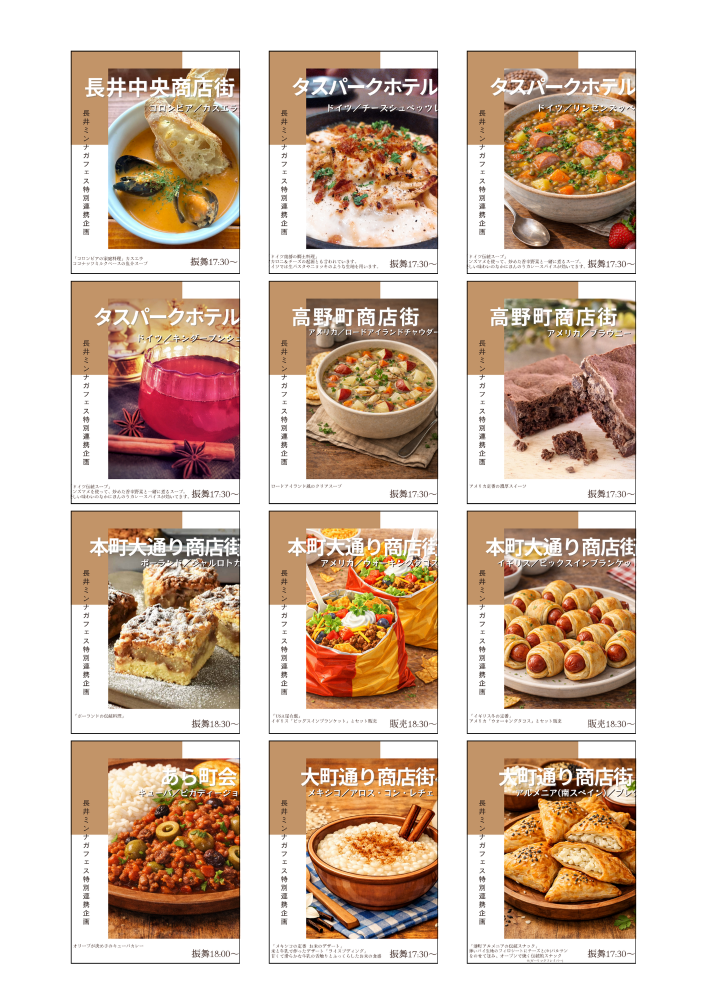 商店街&タスで楽しむ世界のご当地料理『市内で働く外国人のご当地料理企画』長井市のあちこちで世界の味めぐり! 各会場にて以下の通り提供されます!この機会にぜひお召し上がりください(^^♪ ◆長井中央商店街 コロンビア料理 ☆カスエラ「コロンビアの家庭料理」ココナッツベースの魚介スープです。◆あら町商店会 キューバ料理 ☆ピカディージョ「オリーブカレー」オリーブが決めてのキューバカレーです。 ◆大町通り商店街 メキシコ料理 ☆アロス・コン・レチェ(ライスプディング)「メキシコの定番 お米のデザート」米と牛乳で作るメキシコの伝統的デザートです。家族の集まりや特別な日に楽しまれ、やさしい甘さと米の食感が特徴。子供から大人まで親しまれ、好みでスパイスやドライフルーツを加えて味わいます。 アルメニア料理 ☆ブレク「ブレクは南スペイン・アルメニア地方の伝統的スナック」薄いフィロ生地にガーリック風味のチーズを包み、卵やごまをのせて焼き上げます。香ばしく、家庭でも手軽に作れる人気の軽食です。◆高野町商店会 アメリカ料理 ☆ロードアイランドチャウダー ※カリフォルニア「ロードアイランド風のクリアスープ」☆ブラウニー ※ミネソタ「アメリカ定番の濃厚スイーツ」アメリカの家庭菓子です。◆本町大通り商店街 ポーランド料理 ☆シャルロトカ「ポルトガル伝統料理」アップルパイのようなポルトガル伝統料理です。 アメリカ料理 ☆ウォーキングタコス「USA屋台飯」 ※イギリス「ビックスインブランケット」とセット販売です イギリス料理 ☆トムのピッグスインブランケット「イギリス冬の定番」※アメリカの「ウォーキングタコス」とセット販売です ◆タスパークホテル長井 ドイツ料理 ☆チーズ(ケーゼ)シュペッツレ 「ドイツ南部の郷土料理」マカロニ&チーズの起源とも言われています。ドイツでは生パスタやニョッキのような生地を用います。☆リンゼンズッペ「ドイツ伝統スープ」レンズマメを使って、炒めた香味野菜と一緒に煮るスープ。優しい味わいのなかに、ほんのりカレースパイスが効いています。☆キンダープンシュ「ドイツ冬の定番ドリンク」ぶどうを中心に温めたフルーツジュースにシナモンやクローブなどのスパイスを効かせたノンアルコールドリンク。すっきりした甘さに仕上げられており、お子様の冬の飲物の定番。【数量限定/無くなり次第終了】※提供時間は各エリアにより異なりますのでご了承下さい(*'ω'*)