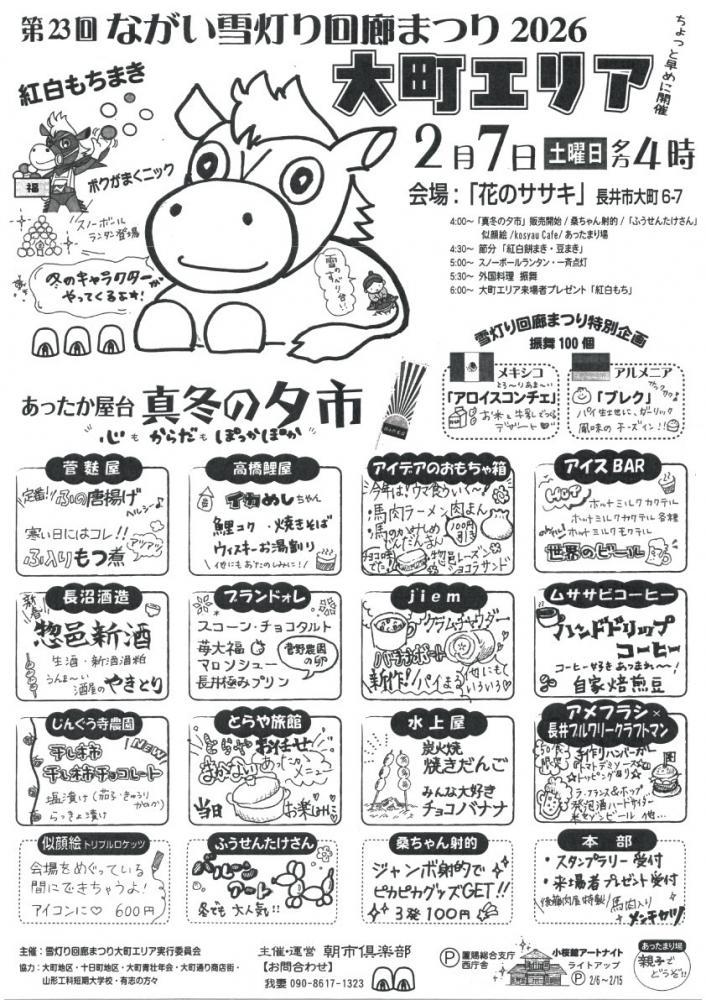 第23回 雪灯り回廊まつり2026 「大町エリア」を紹介!雪と灯りが織りなす幻想的な冬のイベント「雪灯り回廊まつり」大町エリアでは、地元グルメや体験企画、ライトアップなど、世代を問わず楽しめる催しを多数ご用意しています。※詳しくはPDFをご覧ください。 ◆開催日時:2月7日(土) 午後4時〜◆会場:花のササキ ( 山形県長井市大町6-7) ゚*.。.━━━━━タイムスケジュール━━━━━━.。.*゚ 午後4時〜「真冬の夕市」販売開始菅麩屋・高橋鯉屋・アイデアのおもちゃ箱・アイスBAR・長沼酒造・ブランドォレ・jiem・ムササビコーヒー・じんぐう寺農園・とらや旅館・水上屋・アメフラシ×長井ブルワリークラフトマン 桑ちゃん射的/「ふうせんたけさん」/似顔絵/kosyau Cafe/あったまり場 午後4時30分〜節分「紅白餅まき・豆まき」 午後5時〜スノーボールランタン・一斉点灯 午後5時30分〜外国料理 振舞 (100個)メキシコ料理 アルメニア料理 午後6時〜大町エリア来場者プレゼント「紅白もち」 この他にも☆雪のすべり台☆スタンプラリー冬のキャラクターがやってくる!☆小桜館アートナイト・ライトアップ などなど お楽しみ企画が盛りだくさんです!ぜひお越しください(*'ω'*) 主催:雪灯り回廊まつり大町エリア実行委員会