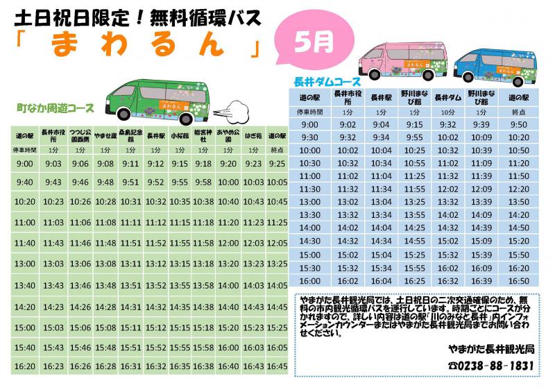 土日祝日限定!無料観光循環バス「まわるん」が元気に走っております! やまがた長井観光局では、土日祝日の二次交通確保のため、無料の市内観光循環バスを運行しています。 「まわるん」5月の時刻表は コチラ からダウンロードください。(PDF 375KB)バスが走るルートマップは コチラ から。(PDF 524KB) 時期ごとにコースが分かれますので、詳しい内容は道の駅「川のみなと長井」内インフォメーションカウンターまたはやまがた長井観光局までお問合せください。やまがた長井観光局 TEL:0238-88-1831