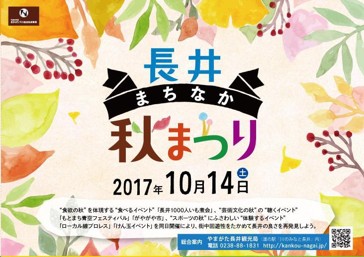 10月14日に開催される「長井まちなか秋まつり」イベント内容や場所・時間が丸わかりのチラシが完成しました! "食欲の秋"を体現する"食べるイベント"「長井1000人芋煮会」"芸術文化の秋"の"聴くイベント"「もとまち青空フェスティバル」「がやがや市」"スポーツの秋"にふさわしい"体験するイベント"「ローカル線プロレス」「けん玉イベント」長井を代表するイベントが同日開催まちなかをまわって長井の良さを再発見しよう。 下記よりチラシをダウンロードしお使いください!長井まちなか秋まつり(jpg) オモテ ウラ
