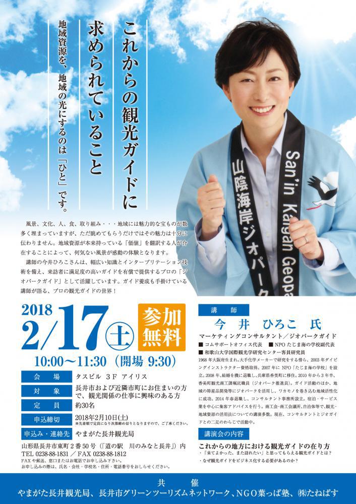 2月17日(土)に観光ガイドについての講演会を開催します。講師は、兵庫県香美町在住の 今井ひろこさん。マーケティングコンサルタントやジオパークガイドとしてご活躍中です。 なぜ、観光ガイドの講演会なのか。「長井に来ていただいたお客様に長井のファンになってもらい、より多くのお客様にお越しいただくには、地域の話題を分かりやすく解説する技術が必要だ。」と考えた長井の有志の皆さんの熱い想いがあり、今回の講演会が実現しました。今回は、ジオパークガイドとして地域の魅力を解説するプロである今井さんに、プロの観光ガイドの世界を教えていただきます。 観光関係の仕事に興味のある方は、ぜひお気軽にご参加ください。 【講演会】「これからの観光ガイドに求められていること」●日時:2018年2月17日(土) 10:00〜11:30(9:30開場)●場所:タスビル3階 アイリス●参加料:無料●対象:長井市および近隣市町にお住まいの方で、観光関係の仕事に興味のある方●定員:約30名(先着順で定員になり次第締め切りとなります)●内容:これからの地方における観光ガイドの在り方●講師:今井ひろこさん(マーケティングコンサルタント・ジオパークガイド)●申込み先:やまがた長井観光局 〒993-0003 山形県長井市東町2番50号 TEL 0238-88-1831 FAX 0238-88-1812●申込み方法:2月10日(土)までにFAXや郵送、窓口またはお電話でお申込みください。お申込みの際は、氏名、会社・学校名、住所、電話番号をお知らせください。 詳しくは、こちらのチラシをご覧ください。(「こちらのチラシ」の部分をクリックすると、PDFデータがご覧いただけます。)