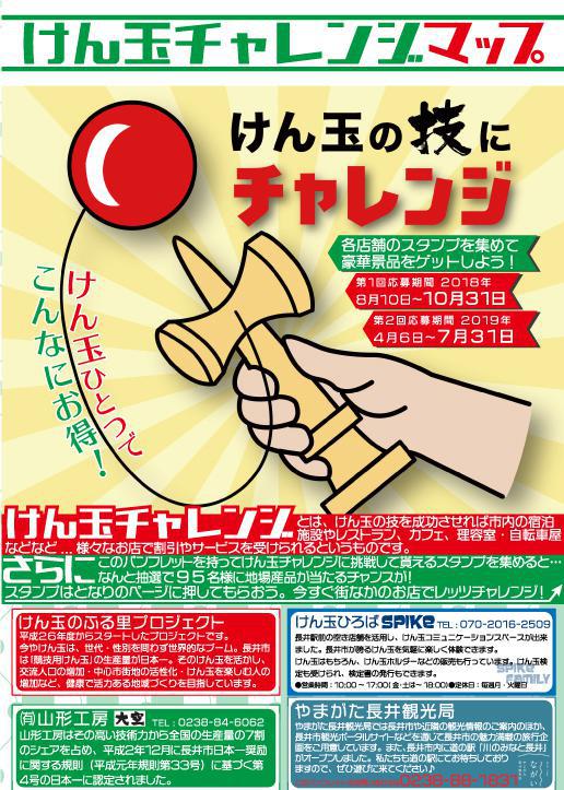 今年の5月12・13日に行われた「けん玉の日2018」そこで行われたイベントのひとつけん玉チャレンジラリー街なかのお店に行ってみたくなる!との反響を受け、けん玉チャレンジ実施店舗がひと目で分かる『けん玉チャレンジマップ』を作成しました。 実施店舗数ですが、なんと【54】もの企業・店舗様にご協力いただきました。そして、たくさんの店舗を回ってスタンプを集めた方の中から抽選で【95名様】に豪華な地場産品のプレゼント!応募期間は全部で2回!集めたスタンプ数に応じて様々な景品が用意されております。 じゃあどんなものが貰えるの?と気になる方も多いはず!そこで今回は、最も多くの店舗を回ってくれた方に贈られる【コンプリート賞(50スタンプ以上)】をご紹介します。まずは『えんどう肉店 米沢牛3,000円相当』かの有名な米沢牛がドドンと3,000円分も貰えちゃいます。2回目に応募した方の中から1名様にプレゼント! お次は『オアシス 冷やしシャンプー&トリートメントセット』山形といえばコレ!使えばすっきりリフレッシュできるセットが貰えます。各回応募した方の中から1名様にプレゼント! そして、けん玉ファンならぜひ手にしたい景品がもう一つ『去R形工房 限定けん玉』!!ご存知、山形工房さまからその時々の限定けん玉が貰えちゃいます!※何が貰えるかは誰も知りません。各回応募した方の中から3名様にプレゼント! マップは道の駅や市内の協力各店舗様に置いております。さっそくマップを持って、街なかのお店でレッツチャレンジ!! 【訂正】チラシ配布版にて2件訂正がございます。1.表紙裏の景品表示欄において「25スタンプ賞」となっておりますが、正しくは「20スタンプ賞」となります。2.裏面 『ウォームストーン』店舗説明の営業時間が「9:00〜18:00」となっておりますが、正しくは「9:00〜16:00」となります。また、「不定休」の表記も追加しましたのでご注意ください。ご迷惑をおかけしましたこと心よりお詫び申し上げます。