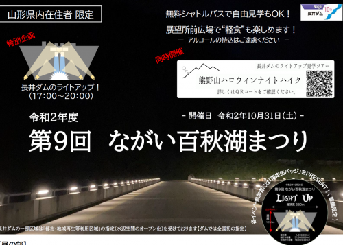 第9回 ながい百秋湖まつり 開催!ダムと地域をつなぎ、水源地域の魅力を発信するため、「第9回ながい百秋湖まつり」が開催されます。長井ダムでは初となる「堤体のライトアップ」を間近で見学できるなど、秋の長井ダムを満喫できる内容になっております。開催内容をご確認いただき、ぜひご来場ください。●イベントチラシ クリックでPDFダウンロード●長井ダムライトアップ探検隊今まで一般の方は入ることの出来なかった堤体の下流広場を開放!堤体内部を通る専用のエレベーターに乗って一気に下っていきます。そして同時刻は長井ダム初の試みとなる堤体ライトアップも実施中です。鮮やかに映し出された長井ダムを目の前で楽しんでください!料 金:大人(18歳以上) 200円 小人(高校3年〜3歳) 100円 2歳以下無料ライトアップ時間:17:00〜20:00※19:30で受付終了、下流広場は30 分「60名」の入場制限がございます。※事前予約は行っておりません。エレベーターへ一度に乗れる定員の関係上、屋外での待ち時間が発生する場合がございます。十分な防寒対策をした上でお越しください。 ●問い合わせ(一社)やまがたアルカディア観光局0238−88−1831