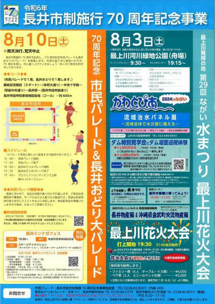 最上川発祥の地である水のまち 長井」で開催される「水」をテーマにしたイベント。水に親しむ様々な体験コーナーやイベントが行われます。また、夜の最上川花火大会では最上川の水面が美しく彩られ、毎年子供から大人まで多くの人で賑わう、長井の夏の目玉イベントです! 《日 時》令和6年8月3日(土)《時 間》オープニングセレモニー午前9時30分〜最上川花火大会 午後7時30分 打上開始《場 所》最上川河川緑地公園(舟場)《駐車場》白つつじ公園・長井市役所・旧市役所向市民駐車場・西置賜地域振興局・あやめ公園※上記駐車場は会場付近までのシャトルバス運行有り ←詳しくはタップ他/ 『最上川こいで河川公園』など その他 駐車場及び会場案内 ←詳しくはタップ ※会場内(最上川河川緑地公園)へは17時以降 車両の出入りができませんのでご注意ください ※長井橋上での見物は安全上禁止します。お車の徐行運転や停車もご遠慮ください。 《アクセス》フラワー長井線「長井駅」より徒歩15分山形蔵王ICから車で約1時間 福島飯坂ICから車で約1時間30分 ※雨天決行 強風の場合は中止。但し花火大会は順延となります。 翌日4日(日) 午後7時30分〜 かわとぴあ’2024 inながい■「パネル展」「川に関するDVD上映」「防災グッズ展示」「洪水氾濫時疑似体験」 山形河川国道事務所 TEL023-688-8933上下水道展in水まつり 巨大蛇口/噴水が目印です!■上下水道機器展示コーナー■ゲームコーナー(水中コイン落とし・輪投げ・水ヨーヨー)■ふれあいコーナー(水鉄砲射的・スーパーボールすくい) 長井上下水道工業協同組合・長井市上下水道課体験コーナー■高所作業車に乗ってみよう!午前10時〜正午 ※定数になり次第終了します。 (一社)西置賜建設業協会 大抽選会 ー 花火大会は”ゆかた”で行こう ー先着200名大抽選会が行われます!受付は17時〜 定数になり次第締め切り 南国特産物販売 沖縄県 金武町交流物産展 沖縄県の美味しい特産物が買えます♪ 毎年大好評となっております!今年はマンゴーの販売個数が少なくなっておりますので、大変申し訳ありませんが、お買い求めは1家族1箱までとさせていただきます。楽しみにしていただいていたところ誠に申し訳ございませんが、ご理解ご協力を賜りますようお願いいたします。なお、販売は10時からですが、9時から整理券を配布します。 19:15〜【花火大会開会セレモニー】最上川花火大会 打ち上げ開始:19:30 21:00終了予定 市民の皆さんへ贈る花火ショー!大曲の匠の技をお楽しみください!★花火は会場イベントの為、一時中断しますのでご了承ください。★立入禁止区域、駐車禁止区間がありますのでご注意ください。★雨・強風の場合は順延します。 有料席販売いたします!・ファミリー席(4人/テーブル・イス席)4,000円・ペア席(2人/ビニールベット仕様)3,000円 受付開始日:7月16日(火) 9:00〜 (17:00まで平日のみの受付)お問い合わせ先:長井市観光協会 TEL/0238-88-5279 ★ ゴミは必ず持ち帰り、町をきれいにしましょう。 地区の皆様にご迷惑かからない様、楽しいまつりにしましょう。★ 午後5時以降は、会場内への車の乗り入れはできません。★ 駐車場は、つつじ公園・あやめ公園・市役所駐車場・市民駐車場(旧市役所向)・最上川こいで河川公園の駐車場等をご利用ください。※指定場所以外の場所(店舗等)へは駐車することのないようお願いいたします 長井ダムでも「水まつり」に合わせてイベントが行われます! ■ダム特別見学会 いつもは行けない所からダムを見よう! 時間:10:00〜※上記は当日9:30より『野川まなび館』にて受付開始となります。先着順・人数に達した時点で終了となります。■ダム湖面巡視体験 2艇の巡視船でながい百秋湖を回ります。 《 『ダム湖面巡視体験』については、降雨による水位状況により中止となりました(7/30)》見学の様子はコチラからご覧になれます。※受付は、当日のみとし、事前受付、予約等はできません。※当日は、野川まなび館までの移動は各自でお願いします。 野川まなび館からダムまでの移動はバス及び連絡車を運行します。※長井ダムは自然豊かな環境であり、蜂やコシジロアブ(俗称)が飛び回る時期です。 虫刺され等十分ご注意ください。※小学生低学年以下の方の「ダム特別見学」は必ず保護者同伴でお願いします。※当日の天候等により急遽中止となる場合があります。ご了承ください。 会場内・周辺上空での小型無人機「ドローン」の飛行については、来場者の安全確保のため禁止しております。ご理解ご協力お願い致します。 ながい水まつり・最上川花火大会交通規制・駐車場シャトルバス会場案内 ☆.。.:*・°☆.。.:*・°☆.。.:*・°☆☆.。.:*・°☆.。.:*・°最新状況などは【長井市観光協会 SNS】で発信しております以下より是非ご確認ください(*^ω^*)!!FacebookInstagram☆.。.:*・°☆.。.:*・°☆.。.:*・°☆☆.。.:*・°☆.。.:*・