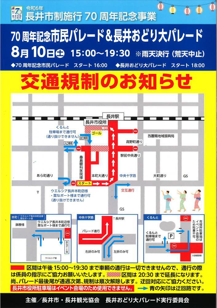 8/10(土)『70周年記念 市民パレード&長井おどり大パレード』開催にあたり交通規制が行われます 周辺地域の皆様はじめ、運転者の皆様には大変ご迷惑をおかけいたしますが、ご理解ご協力のほど何卒よろしくお願い申し上げます。