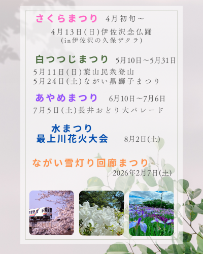令和7年度 主要イベントの日程のお知らせ 置賜さくら回廊◆ 2025年4月初旬 白つつじまつり◆ 2025年5月10日(土)〜5月31日(土)※入場無料 ながい黒獅子まつり◆ 2025年5月24日(土)※桟敷席(有料席)あり、販売時期未定 あやめまつり◆ 2025年6月10日(火)〜7月6日(日)※期間中入園料有料(大人500円、小人(小.中学生)200円) ながい水まつり・最上川花火大会◆ 2025年8月2日(土) ながい雪灯り回廊まつり◆ 2026年2月7日(土) 令和7年度はこちらの日程にてイベントを開催いたします。各イベントの詳細につきましては、決定次第情報を掲載いたします。