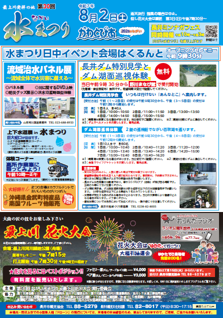 最上川発祥の地である「水のまち長井」で開催される「水」をテーマにしたイベント。水に親しむ様々な体験やイベントが行われます。また、夜の最上川花火大会では最上川の水面が美しく彩られ、毎年子どもから大人まで多くの人で賑わう、長井の夏の目玉イベントです! 《期 日》令和7年8月2日(土) 【日 中】《会 場》くるんと※【ダム特別見学会】は長井ダム(受付は「野川まなび館」)にて 【夕方〜】《会 場》最上川河川緑地公園(舟場)※令和7年度 水まつり日中イベントは「くるんと」にて開催します 長井ミンナガフェス in SUMMER 開催!(10:00〜15:00) 《時 間》午前9時30分〜 《ながい水まつり》オープニングセレモニー イベント開催時間 午前10時〜午後3時 (会場/くるんと) 長井ミンナガフェス in SUMMER ←詳細はコチラ《駐車場》[駐車場案内]8月2日(土)10:00~16:00頃まで長井ミンナガフェス開催に伴い、くるんと内一部駐車場が使用禁止となります。くるんと駐車場が満車の場合は市役所駐車場をご利用ください。[駐車場案内] ------------------------------------------ 【夕方〜】《会場》最上川河川緑地公園(舟場)《花火大会》 最上川花火大会 会場は例年同様『最上川河川緑地公園』です 《時 間》午後4時頃〜(予定) 大道芸 パフォーマンス ※大道芸人たくまる さん によるパフォーマンス/実施時間は状況により随時 午後5時30分〜 花火大会は“ゆかた”で行こう 大福引抽選会 午後6時30分〜 Fam ties サマーダンスステージ 午後7時15分〜 花火大会 開幕セレモニー 午後7時30分 最上川花火大会 打上開始(会場/最上川河川緑地公園) 《駐車場》[駐車場案内]白つつじ公園・長井市役所・旧市役所向市民駐車場・西置賜地域振興局・あやめ公園※上記駐車場は会場付近までのシャトルバス運行有り 他/ 『最上川こいで河川公園』などその他 駐車場及び会場案内 ※会場内(最上川河川緑地公園)へは17時以降 車両の出入りができませんのでご注意ください ※長井橋上での見物は安全上禁止します。お車の徐行運転や停車もご遠慮ください。 《アクセス》フラワー長井線「長井駅」より徒歩15分・山形蔵王ICから 車で約1時間 ・南陽高畠IC → R113梨郷道路から 車で20分 ※雨天決行 強風の場合は中止。但し花火大会は順延となります。翌日3日(日) 午後7時30分〜 ※日中イベント 会場/くるんと 10:00〜15:00かわとぴあ’2025 inながい【流域治水パネル展】■「パネル展」「川に関するDVD上映」「防災グッズ展示」「洪水氾濫時疑似体験」 山形河川国道事務所 TEL023-688-8933【上下水道展in水まつり】 ■上下水道機器展示コーナー■ゲームコーナー(水中コイン落とし・輪投げ・水ヨーヨー・水鉄砲射的・スーパーボールすくい など) 長井上下水道工業協同組合・長井市上下水道課巨大蛇口/噴水が目印です!【体験コーナー】■高所作業車に乗ってみよう!午前10時〜正午 ※定数になり次第終了します。 (一社)西置賜建設業協会 【沖縄県金武町特産品 南国フルーツ他販売】☆大好評☆まつり会場はおいしいものがいっぱい!売店をご利用ください。 このほか、2025年は長井ミンナガフェス in SUMMER として【流しそうめん】【氷のおもちゃ】【くじらミスト】【ミスト迷路】【すいか割り】【風鈴まつり】【水かけ祭り】などを実施します! お子様はもちろん、ご家族で楽しめる企画が盛りだくさん!!日中は『くるんと』に集合!※日中企画は10:00〜15:00まで長井ミンナガフェス in SUMMER↑詳細はコチラ ※花火大会を含む 夕方からのイベント会場は例年同様『最上川河川緑地公園』です 売店も約20店舗出店!焼きそば・焼きとり・から揚げ・かき氷など定番の屋台メニューをはじめ、長井ならではのおいしいものや、お子様も楽しめる金魚すくい・おもちゃすくいなどもあります!食べながら飲みながら、光と音のセッション・職人技の逸品花火を是非間近でお楽しみください! 16:00頃〜(予定)【大道芸 パフォーマンス】 ※大道芸人たくまる さんによるパフォーマンス/実施時間は状況により随時 17:30〜 花火大会は≪ゆかた≫で行こう 【『大福引抽選会』】(ゆかたでご来場の先着200名様限定)ゆかたでご来場の方 先着200名様に大福引抽選会が行われます!受付は17:30〜 定数になり次第締め切り素敵な賞品をご用意! 約1/2の確率であたる!? 是非ご参加ください(^^♪ 18:30〜【Fam ties/サマーダンスステージ】 (ファムタイズ) 19:15〜【花火大会 開幕セレモニー】 19:30〜最上川花火大会 打ち上げ開始 21:00 終了予定 市民の皆さんへ贈る花火ショー!大曲の匠の技をお楽しみください!★花火は会場イベントの為、一時中断しますのでご了承ください。★立入禁止区域、駐車禁止区間がありますのでご注意ください。 ★強風の場合は順延となります。翌3日(日)午後7時30分 有料席販売(※7/15より)※満席となりました《7/22時点》◇ファミリー席(4人/テーブル・イス席)4,000円◇ペア席(2人/ビニールベット仕様)3,000円受付開始:7月15日(火) 9:00〜 (17:00まで平日のみの受付)お問合せ先:長井市観光協会 TEL/0238-88-5279※数に限りがご