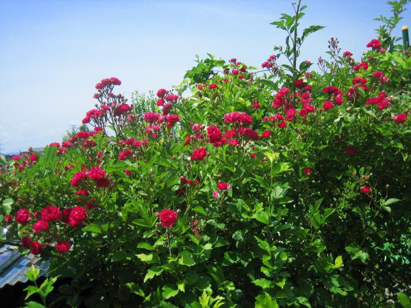 我が家の敷地の片隅に昔から生えているイバラ、草刈りや雪囲いなどの作業時、肌を引掻かれるやら、衣服に絡みつくやらじゃまでしょうがない。親の代から何十年にわたり根元から伐採して根絶やしをはかってきたが、今に至るも衰えることなく花を咲かせ続けている。今年もまた白いノイバラの開花に遅れること2週間程度で紅いイバラが鮮やかに咲きそろった。「○○バラ公園」「××薔薇園」などへ出かけた折に買ってきて丹精を込めた(つもりの)バラが年を経るごとに色あせ劣化していくのに、長年虐待され続けてきた紅いイバラは逆に盛んになり、鮮やかさを増していくようだ。よっぽど土があっているに違いない。そういえば何かの本に「その生命力は根絶するのがむずかしい」と書いてあったようだ。こうなったらこちらも根絶など企てず、棘の痛みをがまんして「紅い野ばら」を『飽かず眺めて愛でる』ことにしようか・・・・『紅(くれない)匂う』野なかならぬ我が家の野ばらを。