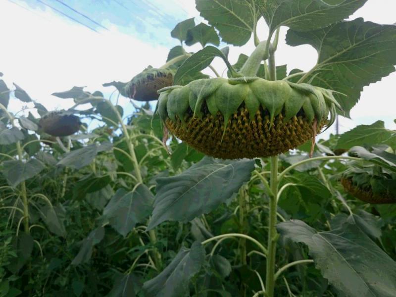 英さん。のヒマワリ観察日記。二百十日過ぎの姿である。みんな、意味があって下を向いている。華やかなあの日の姿をもう一度。断末魔が、種の保存のために、最後の力を振り絞る。ヒンシュクのバイヤー、英さん。去りゆく夏のシンフォニー・・・・・・・第三楽章TO BE CONTINUE・・・・・