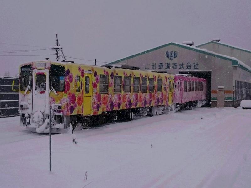 山形県・白鷹町。フラワー長井線の終着駅であり、始発駅の荒砥駅。 山形鉄道「フラワー長井線」の車両基地になっている。 「フラワー長井線」に4輌ある花のラッピング列車。そのうちの2輌。 「桜」と「ダリヤ」のアベックだ。 吹雪の中を潜り抜けてきた姿が美しい。ヒンシュクのバイヤー・・・・・「英さん。」吹雪の荒砥駅に吠える(パートU)To Be Continue・・・・・