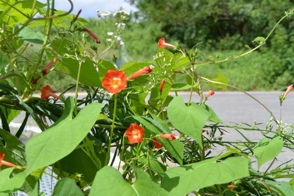 老化予防の散歩は3シーズン目に入った。コースはほとんど変わっていない。周囲に対する新鮮な驚きが小さくなったかわり、季節の変動に伴う草花の変化を予測できるようになり、これはこれで面白い。最近、去年までは見かけなかった花を発見した。1.5cmぐらいの小さな花で、色は朱色。近くの草の茎に蔓を絡ませて生えているので、足元に咲いている感じだ。5角形でラッパ型の花と葉はアサガオそっくりだ。花の時期が長いのも一緒だ。生えている場所は老人の散歩コースでは2ヶ所のみ。直線距離で500mほど離れている。早速図書館へ走った。【マルバルコウソウ】 ・ヒルガオ科ルコウソウ属 ・熱帯アメリカ原産、本州(中部以南)、四国、九州に分布 ・畑地、牧草地、道端、荒れ地に生育、日当りが良いところを好む ・江戸時代観賞用として持ち込まれ野生化した ・今では種は売られていないようだとある。本州中部以南に分布するものが、種も売られていないのに何故この地にあるのだろう?交通インフラの整備が進み、交流の範囲が急速に広がったからか?温暖化の影響で当地も適応可能の条件を満たすようになったからか?来年以降も同じ場所に生えるだろうか?また楽しみが一つ増えた。