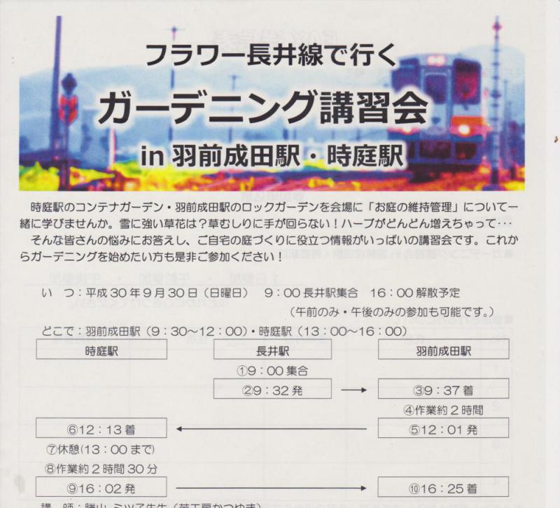 9月30日(日)に時庭駅と羽前成田駅を会場に、ガーデニング講習会が開かれます。9時長井駅集合、16時解散予定です。羽前成田駅での講習会は9時半から12時、時庭駅での講習会は午後1時から4時までとなっています。午前だけ、あるいは午後のみの参加も可能だそうです。なんと日程終了後は、羽前成田駅で講師を囲む会(会費2000円)も予定されているそうです。ふるってご参加ください。【問い合わせ・申し込み先:長井市役所商工観光課観光振興係 0238−87−0827 】
