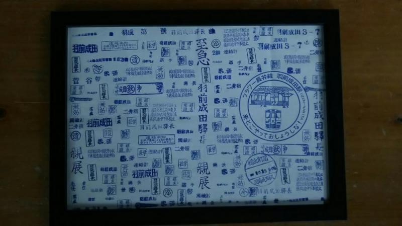 成田駅においでになった方が、駅に残っているスタンプや判子、焼き印などを使って作品を作って下さいました。アート作品にも見えて素敵ですね。手ぬぐいにしたら面白いねとか、駅名のスタンプ作品もいいかな、などと盛り上がりました。色んな楽しみ方があるものです。