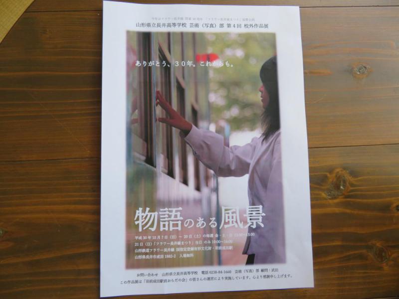 7日から、長井高校写真部の写真展がスタートしました。今回のテーマは「物語のある風景〜ありがとう30年。これからも。」。全国の駅を踏査中の旅行者がおいでになり、「鉄道には高校生が似合います」と語っていかれました。まさに、「富士には月見草、ローカル線には高校生がよく似合う」と感じる作品ばかり。 写真展は、21日(日)までの毎週金・土・日・祝日の午後1時から3時まで。ただし長井線祭りの21日は午前10時から午後2時半まで。どうぞご鑑賞ください。