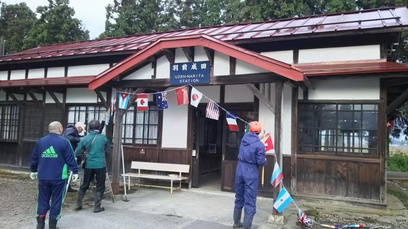山形鉄道開業30周年を祝い、各駅を万国旗で飾ろうとしています。長井線開業100年時の「スマイルプロジェクト」程の熱波はないものの、沿線の感謝の思いを伝えようとするものです。 おらだの会でも14日の朝、広場の草刈り作業の後、成田駅と白兎駅に万国旗の飾りつけを行いました。会員の一人が、「中央が日の丸なのはわかるが、両脇が米国と中国だ。」。その後、白兎駅の旗を見ると、日の丸が二つ並んでいる。再び、「意味深だなぁ。」。 それはさておき、21日は午前10時から長井高校写真部展の開場、11時から芋煮等の販売・縄文祭りの演奏が羽前成田駅前広場で行われます。どうぞお楽しみください。