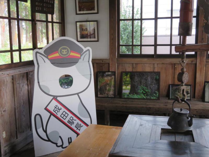 待合室の中に、成田(にゃりた)駅長を置きました。また先の写真展に出展いただいた作家さんから提供を受けた猫の写真も併せて展示しています。寒くなって来ますが、成田(にゃりた)駅のにゃんこ駅長とパチリとして、楽しい思い出の一つにしてくれれば良いなと思います。(写真撮影等で移動した場合は、元の位置に戻しておくようにしてください。)