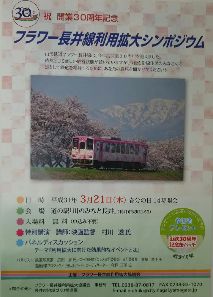 フラワー長井線の開業30周年記念事業の最後は、利用拡大協議会のシンポジウム。映画監督の村川透さん、そして鉄道写真家の広田泉さんという超豪華なゲストを迎えて、地元からはローカル線プロレス実行委員会、蚕桑駅夢プロジェクトの代表がパネリストとして登場します。また、先月、撮影が行われたドラマが、3月17日放送されるとのこと。西村京太郎トラベルミステリースペシャル「十津川警部vs鉄道捜査官 花村乃里子」。そういえば村川監督作品で、沢口靖子さんが主演の「鉄道捜査官」も長井線でロケがされていたのですね。30周年にふさわしい超豪華な2大事業となりました。楽しみですね。