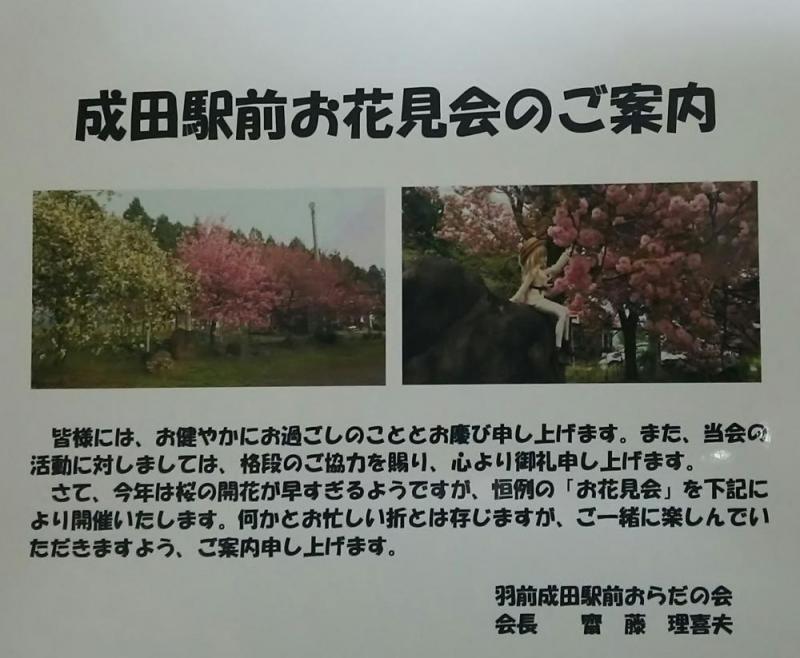 「最後のお願いに上がりました。」という広報車ではないのですが、最後のご案内を差し上げたく参上致しました。明日、21日の午前11時半より羽前成田駅前でお花見会を行います。会費は1000円ですから、もん草とかフキノトウとか大根漬けぐらいかもしれませんが、百人一首の句を詠みながら、楽しく呑んで語り合いましょう。