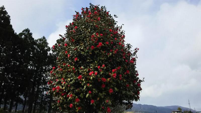 羽前成田駅は、桜の他にも色んな花が咲いています。広場には椿、駅前の花壇にはチューリップ。そして緑色の桜(御衣黄 or 鬱金桜)は、咲く時が来るのを待っているかのようです。