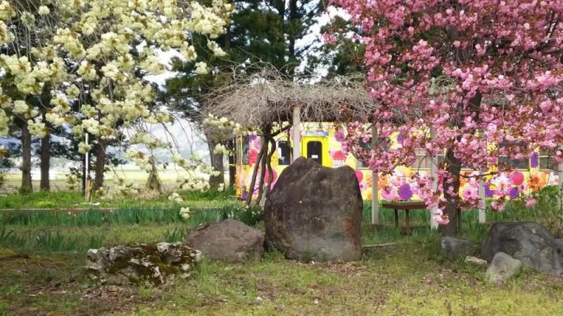 大型連休も後半戦に突入。羽前成田駅前では、お花見の後半戦がスタートしました。ピンクの関山、緑の御衣黄(or ウコン桜)が満開です。また、明日からは加藤弘一写真展「君が愛したフラワー長井線」が始まります。金、土、日、祝日の午後1時30分から4時までです。どうぞお楽しみに。