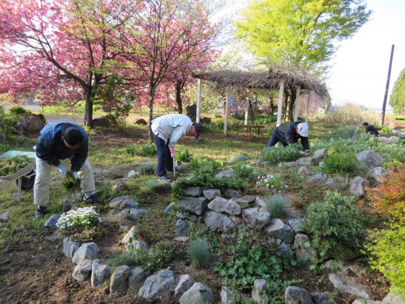 5月4日午前6時、ホーム側花壇の草むしり作業を行いました。昨日は、成田八幡神社の例祭日(黒獅子祭り)で、まだ赤ら顔の会員もいましたが、お花見以来の顔合わせ。また嬉しいことに、桜の撮影に来ていたフラワー長井線の鉄道写真家さんも、手伝ってくれました。有難うございました。機械での草刈り作業も大変ですが、草むしり作業はとても「むさい仕事」だなぁ、と思います。北側には、初めて紅花を植えてみました。昨年設置したベンチと合わせて撮影ポイントになればうれしいですね。