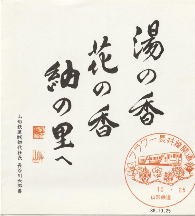 知人から、フラワー長井線の開業を記念して販売された切手シートをいただいた。郵便局の郵趣会が制作したもので、昭和63年10月25日の日付で荒砥郵便局の消印が押されている。シートには?58、D52の蒸気機関車、日中平和友好条約締結10周年記念のパンダの切手も貼られている。山形鉄道初代社長である長谷川六郎さんの「湯の香 花の香 紬の里へ」の揮毫が美しい。
