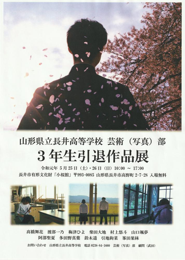 地元の長井高校芸術(写真)部の3年生引退作品展が、今月25、26日、長井市高野町の小桜館で開催されます。3年生は部を牽引して、初の全国大会出場も果たしました。3年間の集大成となる作品がどのようなものか楽しみです。来月からは、写真部の在校生による写真展を羽前成田駅で予定していますが、加藤弘一さんの写真展も5月26日が最終日となりますので、こちらもどうぞお見逃しなく。