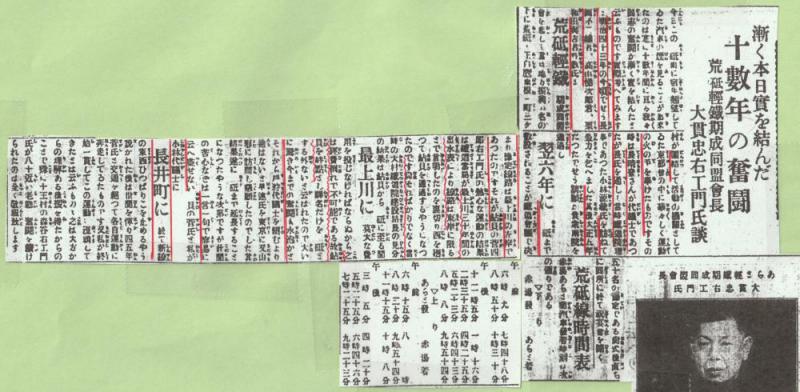 写真は、荒砥駅全通時の米澤新聞に書かれた荒砥町 大貫氏の談話記事である。この中で、長井線に係る幾つかの重要な事実を知ることができる。それによると明治43年の秋頃、長岡不二雄、高山悌次郎、栗和田與吉などと荒砥軽鉄期成同盟会を設立した。(長岡氏を含む4名は、すべて荒砥町長に就任した人物である。)その後、大正3年に荒砥、十王、白鷹、東根の1町3カ村で東部会を設立し、鉄道建設運動を展開することになった。その際、代議士であった長晴登氏を通じ、当時鉄道院理事であった小林源蔵氏を訪ね協力を願ったという。ここで、長氏と小林氏が地元とつながっていたことがわかる。 次に、大正6年には荒砥まで延長されることが鉄道会議で決定されたという点である。長井から荒砥までの延長が決定された時期を初めて確認することができたのである。ただし、この段階での決定が、最上川の右岸ルートであるか左岸であったのかは、新聞文字がつぶれており明確でないが、その後の流れから類推すると、6年時点では右岸に設定していたものとみられ、それが鮎貝の菅四郎右衛門氏などの運動で、左岸となったのではなかろうか。大村建設局長の「最上川に架橋することはできないから鮎貝駅を終点として荒砥駅と命名せざるをえない」との談に対して、このままでは「今までの奮闘が水泡に帰す」との思いは、かなり緊迫した状況があったことを示している。 こうした状況において、小林氏が鮎貝の菅氏と荒砥の大貫氏に、「東西の引っ張りこをやめよ」と説得したというのである。この時期、西置賜郡長は清水徳太郎であるが、彼もまた鉄道院出身であったことも、調整役として関わったように思えて来る。清水郡長については、改めて紹介することとして、大正8年4月には成田地内の測量に入り、9年12月には工事に着工していることから、それ以前には念願の荒砥までのルートが決定されていたと考えられる。 地元の思いと政治家と、鉄道官僚の思いがぶつかり合い、紆余曲折を繰り返しながら到達した一番列車だったのだろう。 【新聞記事提供:米澤新聞 大正12年4月22日(二)】